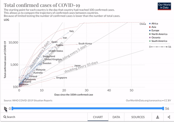 As such, we found this graph which we nicknamed the “COVID Curve” particularly useful in tracking the speed of reported infections across countries. The log graph maps the total number of confirmed cases in each country over time once the 100th confirmed case is recorded in a country.
