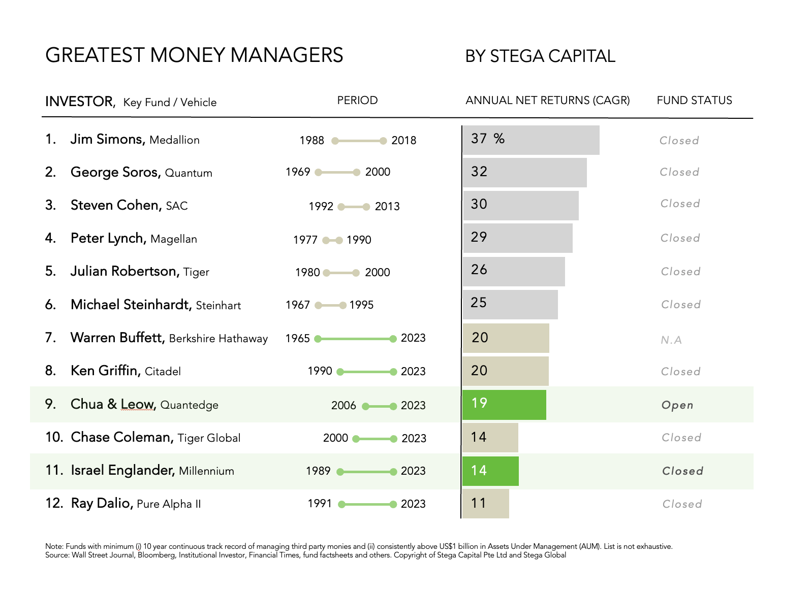 Note: The original shortlist of Managers was from a November 2019 Wall Street Journal article titled “The making of the world’s greatest investor” which had Medallion, Quantum, SAC, Magellan, Berkshire Hathaway and Pure Alpha only. We added Tiger, Steinhardt, Quantedge, Millennium, CItadel and Tiger Global after verifying their returns from multiple public sources which is by no way, complete or exhaustive. Do reach out to us at ir@stegacap.com if you are keen to nominate a Manager for inclusion and the source of your findings. As an Investment Office, we may prioritise Managers that are still open to further investments.